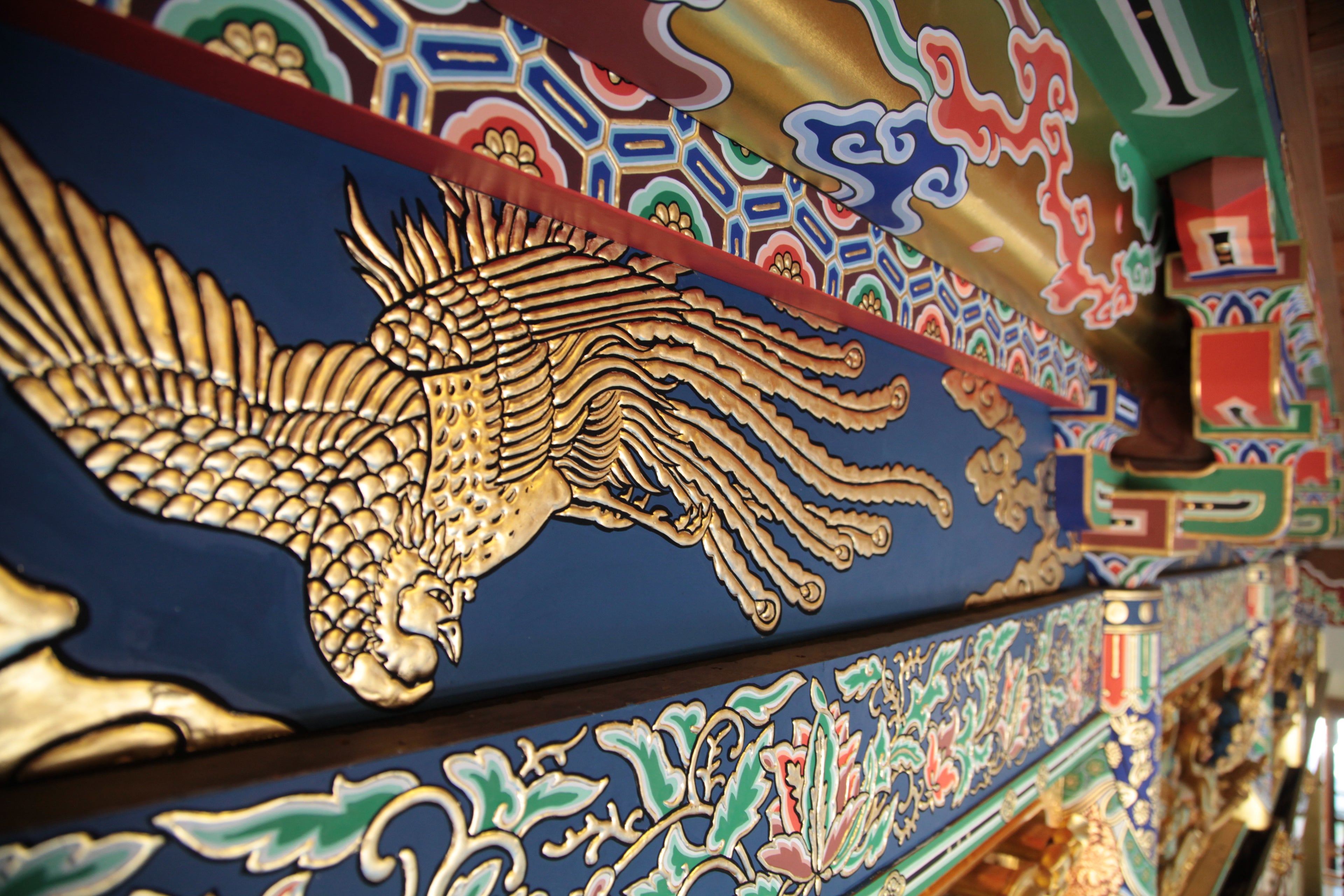社寺建造物彩色・神仏具彩色・天井画・頂相画・壁画・襖絵・絵馬・狛犬・随神・御神鏡などの復元と新調、また截金・古美術修復など、一切の神仏荘厳を行います。