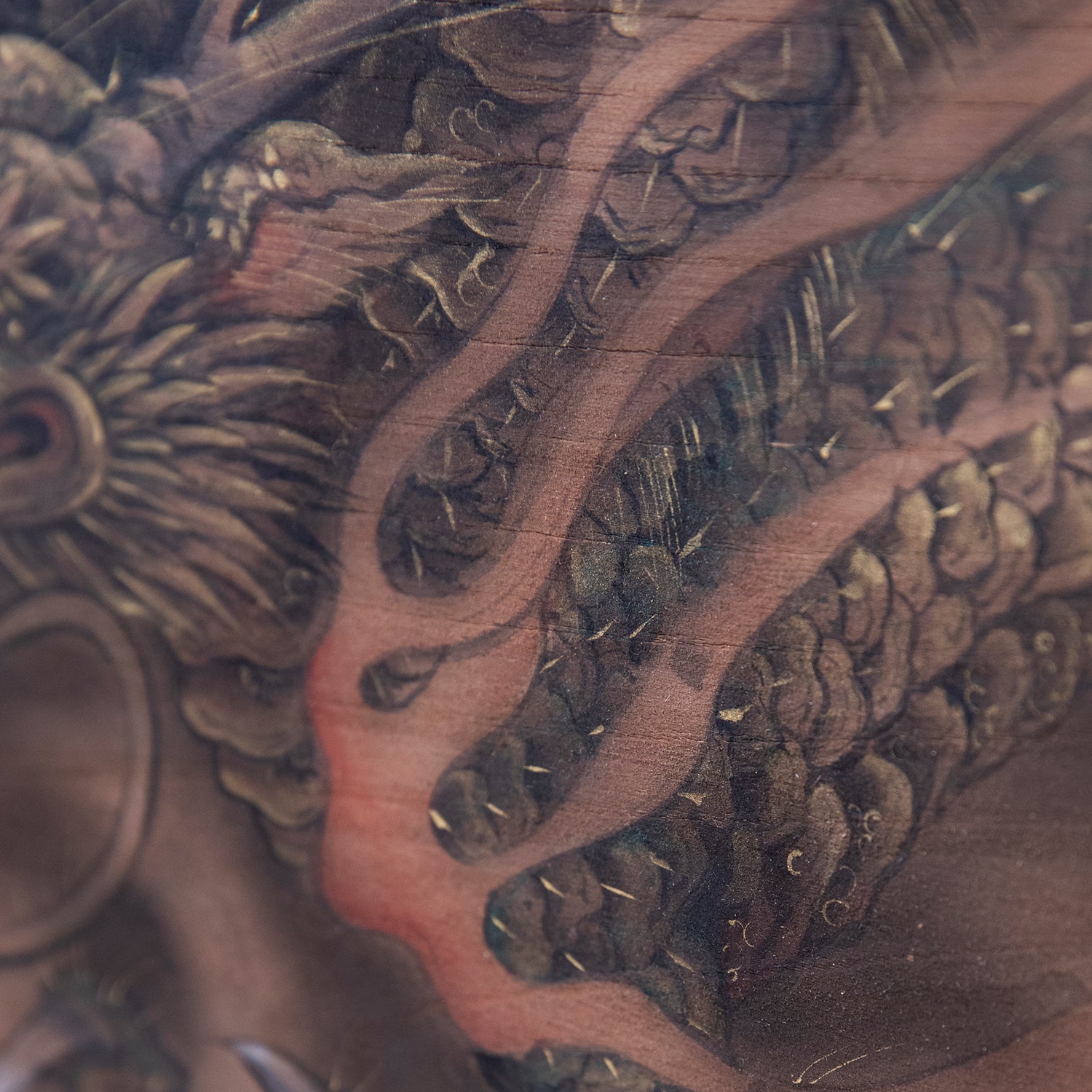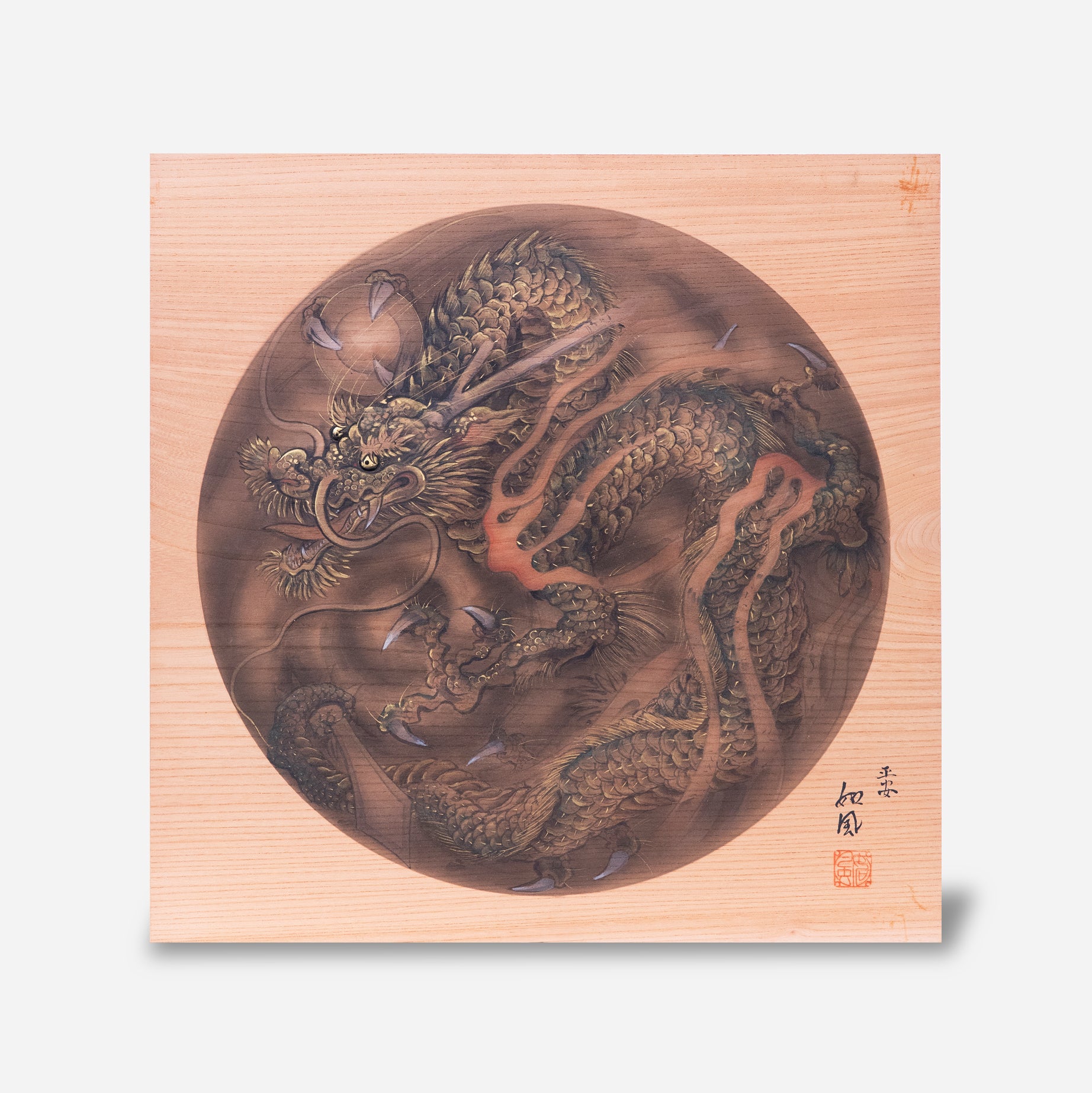 龍は、古来中国より伝来した想像上の霊獣です。角は鹿、頭は駱駝(らくだ)、目は鬼(又は兎)、首は蛇、腹は蜃(しん)、鱗は魚、爪は鷹、掌は虎、耳は牛に似ているとされ、これを「龍の九似」といいます。中国において吉祥文様の最高位の座である龍文様は、日本においてはそこまでの存在ではありませんが、水をキーワードに、吉祥文様として用いられます。また、龍はその獰猛な容姿で雨を降らせ、人々に災いも恵みももたらす霊獣としても信仰されています。まさに自然に対する畏怖の念と同様であり、全知全能の神のような存在なのかもしれません。