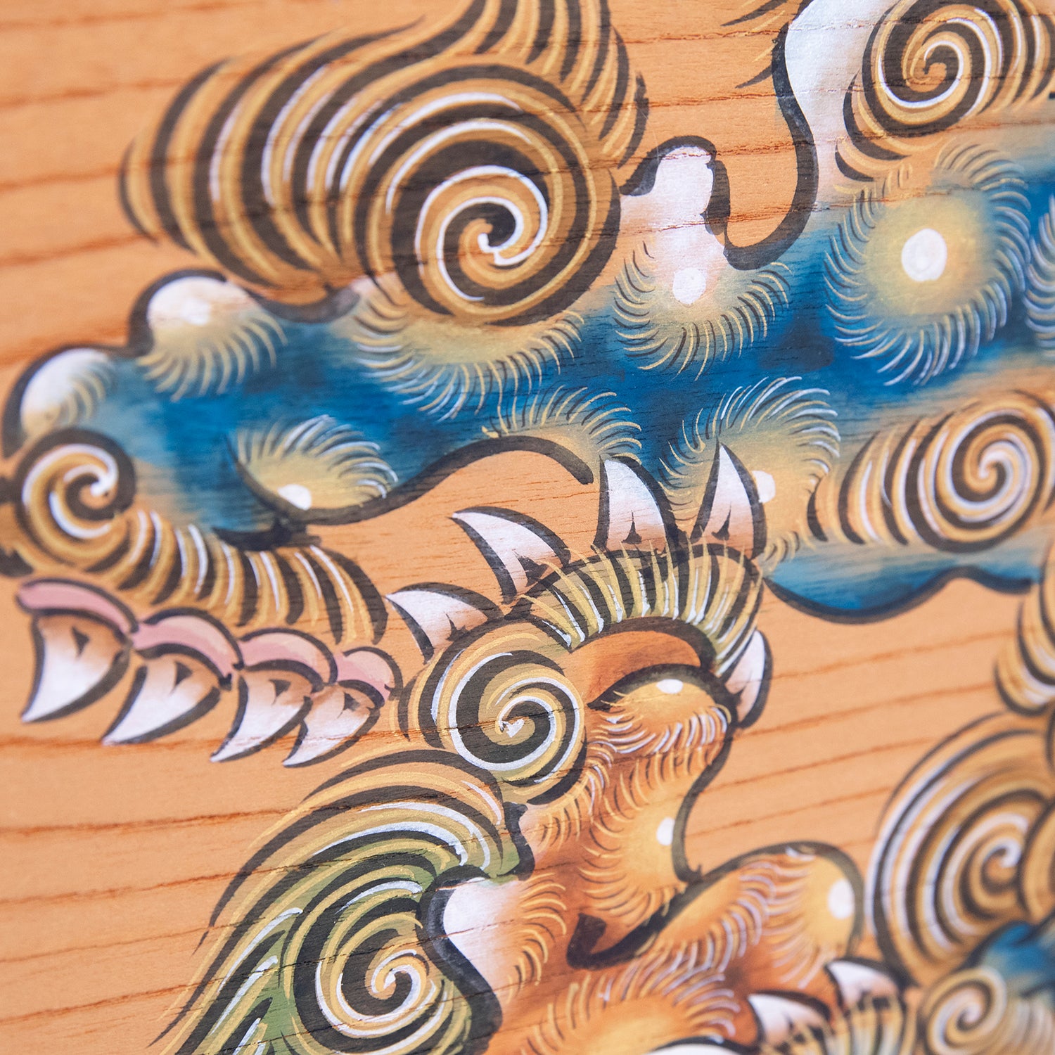 今作は、唐獅子二匹を巴形に沿って描いた作品です。唐獅子は、一応ライオンがモデルであるとされていますが、想像上の動物として確立しているため、ライオンとは異なります。古来より人間は、力の強い動物(それが実物であれ空想上であれ)をもって権威や身辺を護るべく、それらを家紋としたり、大切な場所にそれらを設置するなどしてきました。エジプトのスフィンクスが良い例かと思います。唐獅子文様は、美しい吉祥文様とは異なりますが、魔除けの益が、ひいては繁栄をもたらす文様として、いつの世も人々の心の平安を守り続けてきた文様なのです。