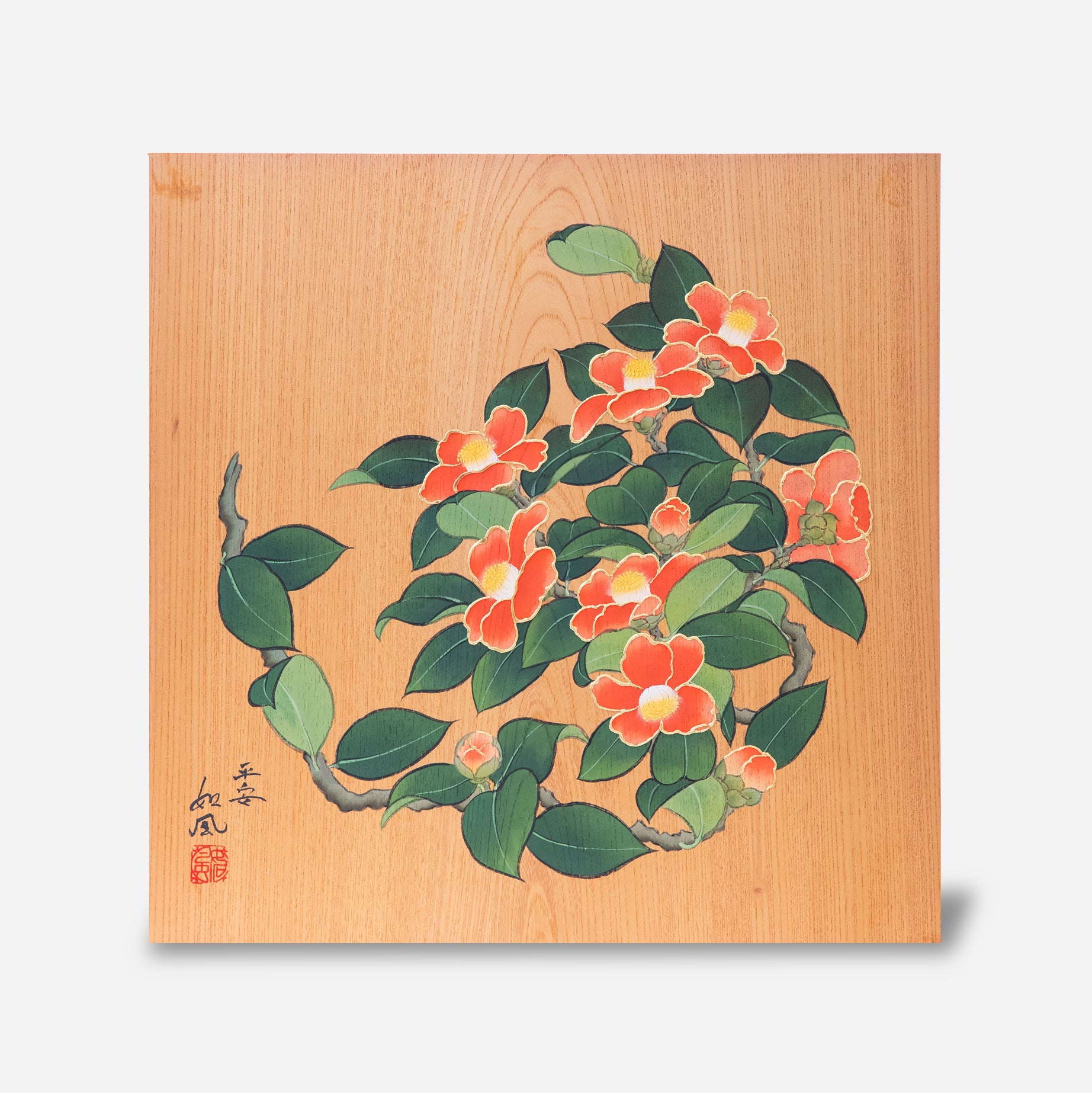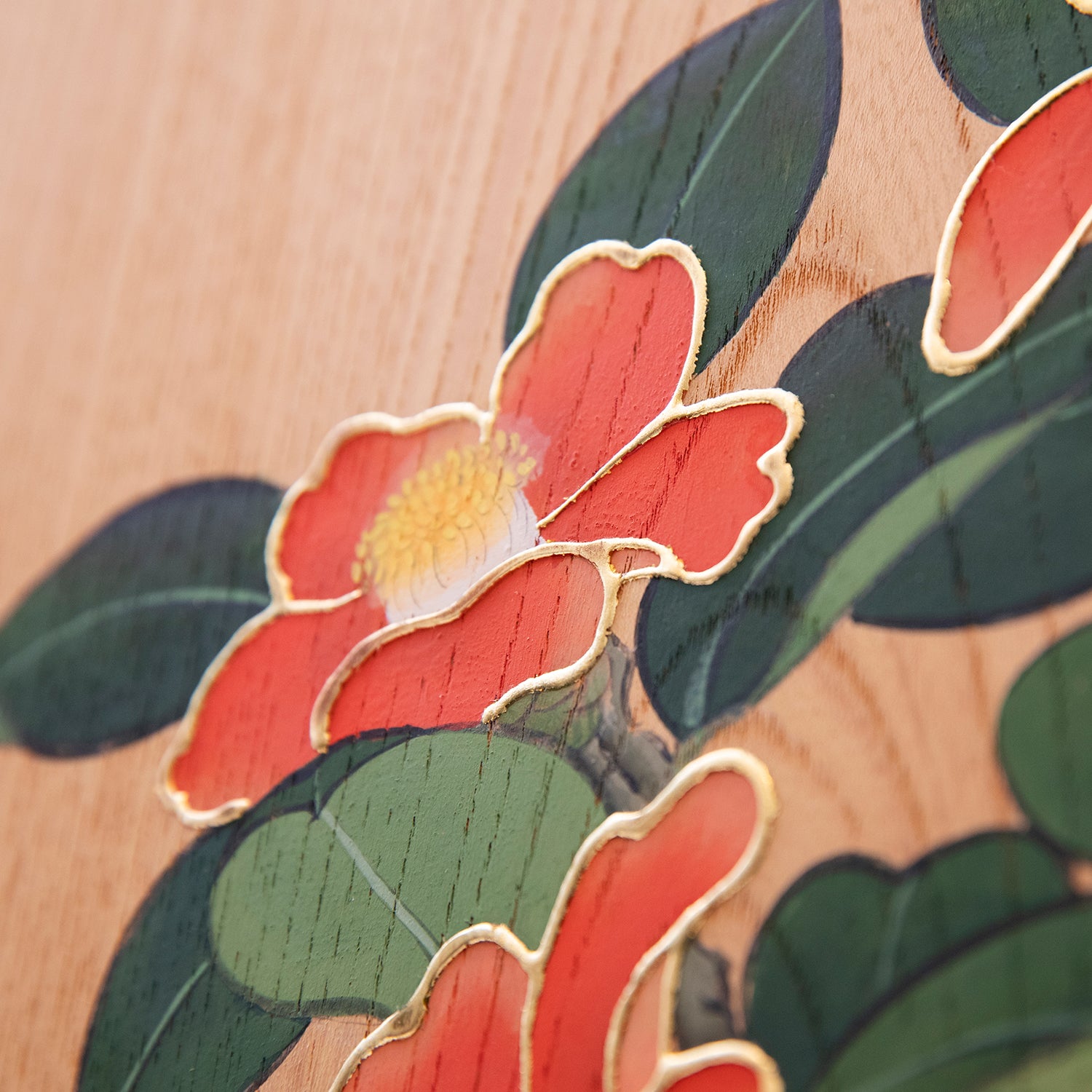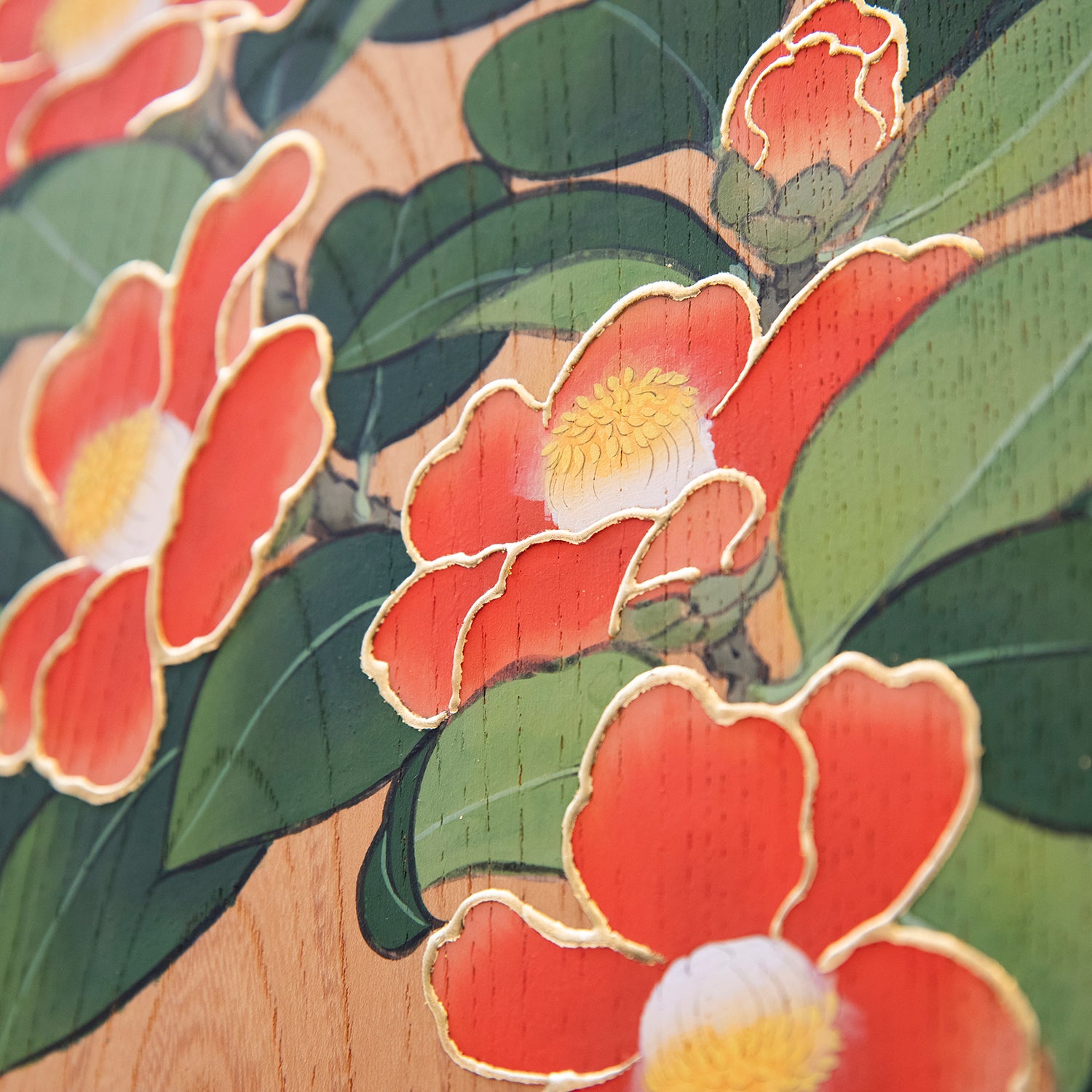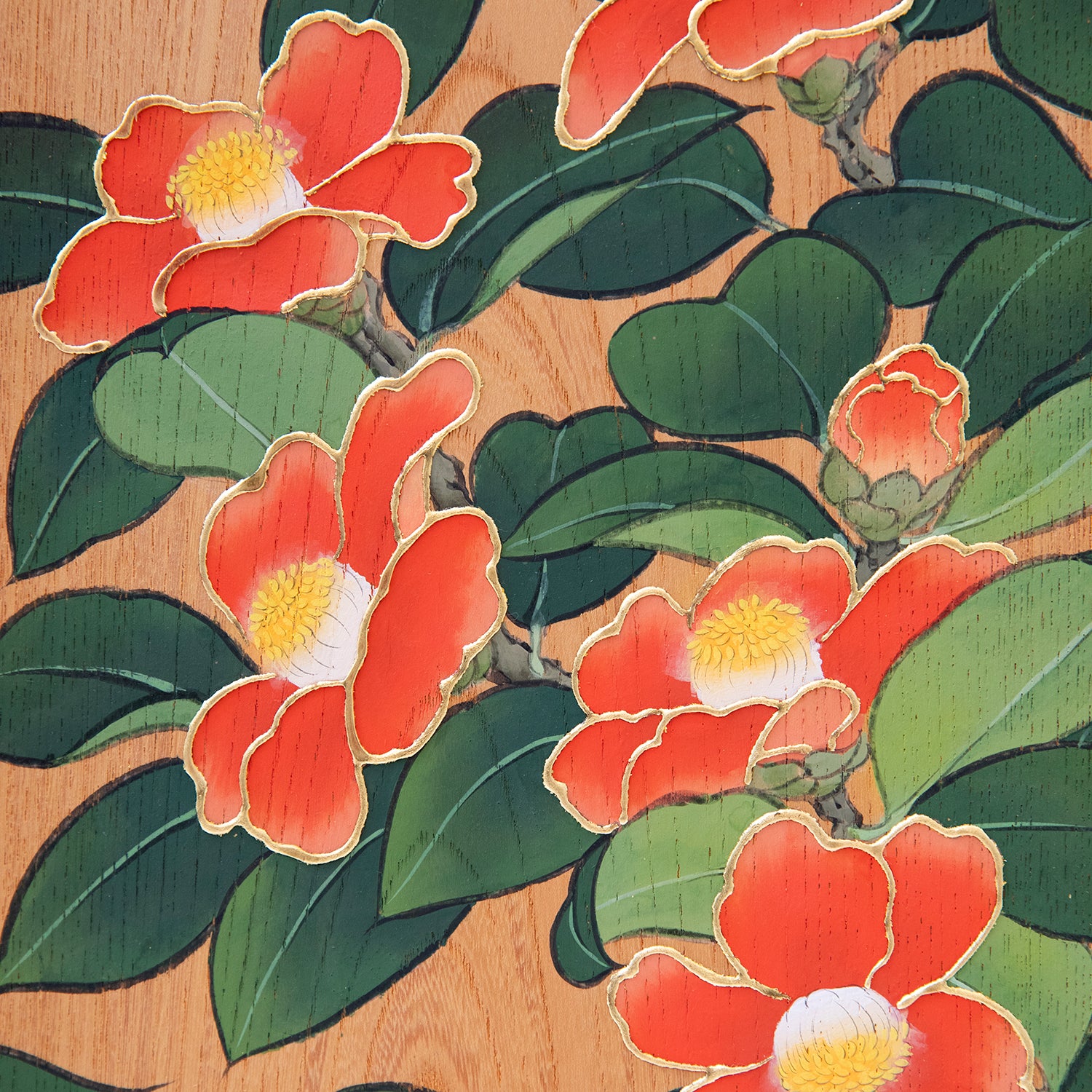2~4月ごろに開花するツバキ科の植物。万葉の時代から日本では愛され、茶道世界においても、花があまり咲かない冬の茶席を華やかに彩ってくれるため「茶花の女王」という称号を持つほど珍重されています京都でも、安寺の「侘助椿」や、妙心寺・大雄院の「大雄院椿」などがあります。 大雄院の襖絵に描かれている大雄院椿は、柴田が心を描いた白の侘助椿を、私が大雄院椿に描き変えたものです。