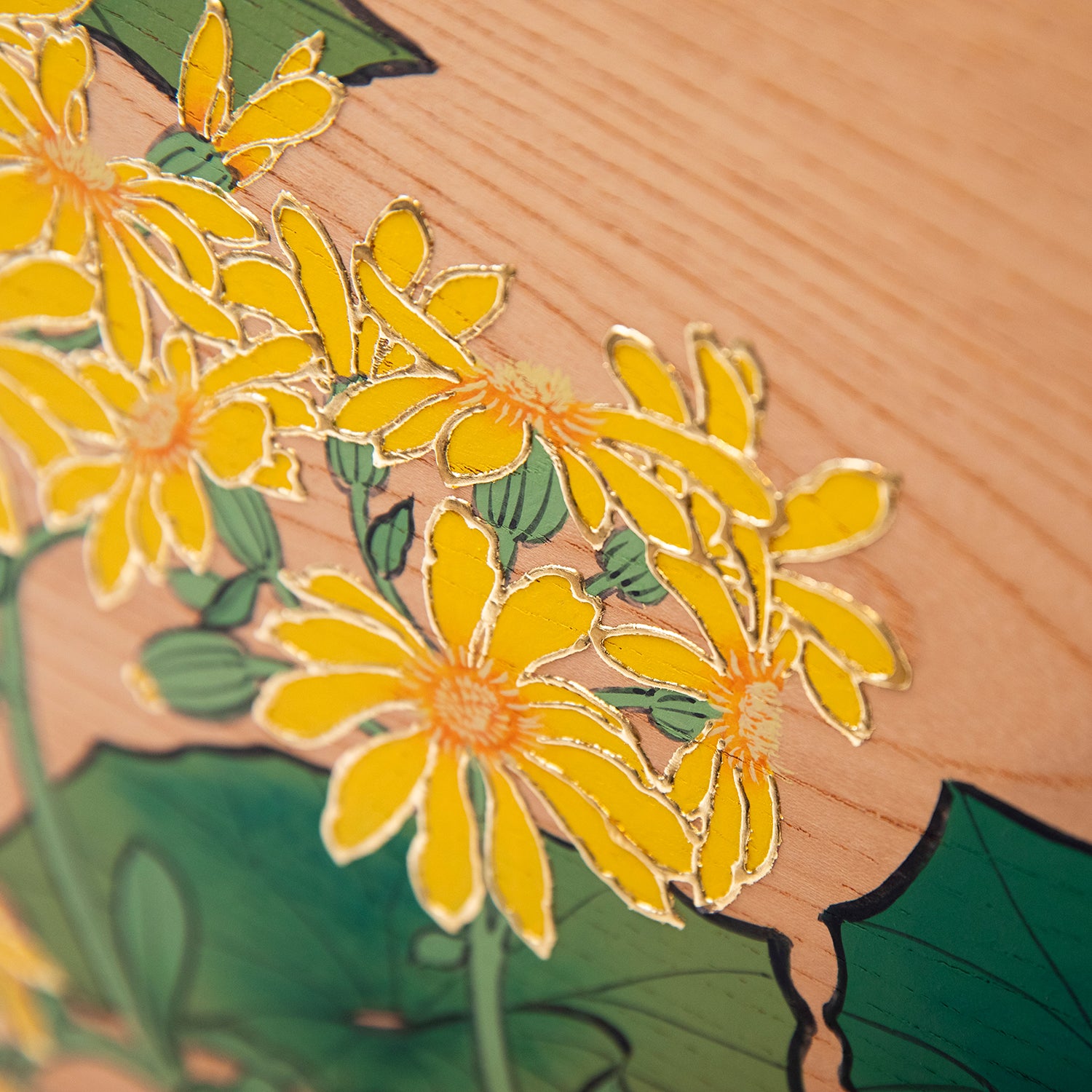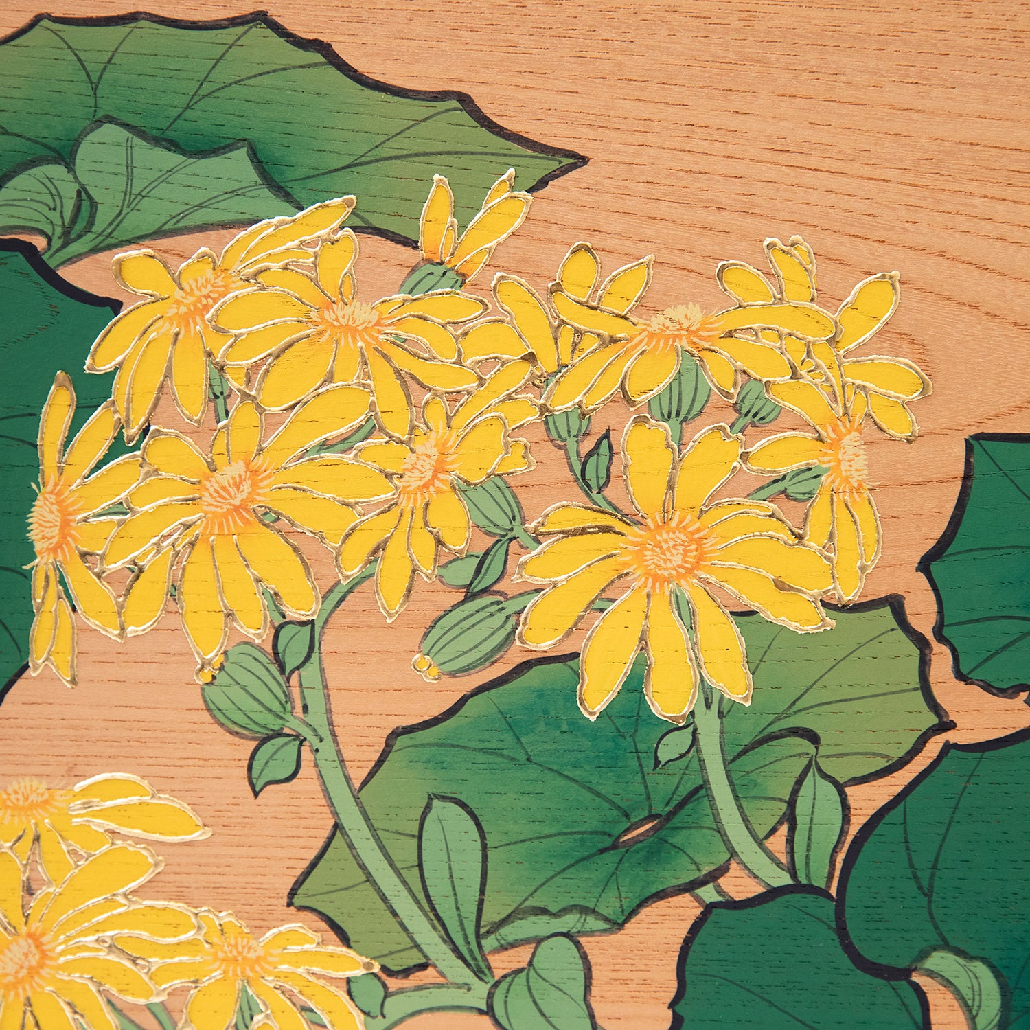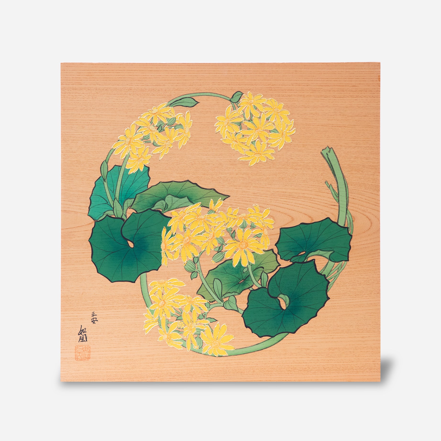 10~1月ごろに開花するキク科の植物。和名は、艶葉蕗(艶のある葉をもった蕗)が転訛したものである、という説もあります。木陰や日陰を好む性質から、日本庭園の石組みや木の根元などによく植えられる植物です。板材:欅合板 縁に金使用寸法:45㎝角品番:0036